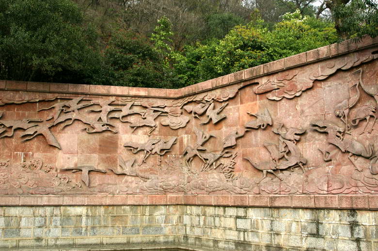 在黄鹤楼东南240米外,位于景区白龙池边,是国内最大的室外花岗岩浮雕。整个雕塑呈红色,99只仙鹤呈现种种不同的舞姿。浮雕依蛇山山势呈不等距Z形,全长38.4米,高4.8米,云蒸霞蔚,日月同辉,江流不息,生机盎然。99只不同动态的仙鹤,和谐分布在松、竹、海、灵芝、流水、岩石、云霞中。